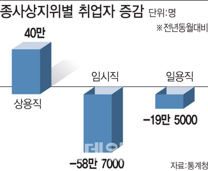 이와 함께 불안정한 일자리에 있는 임시·일용직 감소세가 두드러진 것도 특징이다. 임금근로자 가운데 임시근로자는 58만7000명(12.0%) 감소해 1990년 1월 이후 가장 큰 폭으로 줄었다. 일용근로자 역시 19만5000명(13.7%) 감소하며 지난 2016년 5월(27만1000명) 이래 최대 감소 폭을 보였다. 이 역시 이들이 일자리를 잃고 실업자나 비경제활동인구로 전환한 때문으로 풀이된다.
