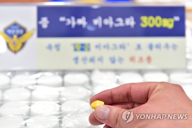 (서울=연합뉴스) 지난 24일 해양경찰청 외사과에서 조사관이 중국인 밀수업자로부터 압수한 중국산 가짜 성 기능 치료제 비아그라를 공개하고 있다. 2019.4.25 [해양경찰청 제공]