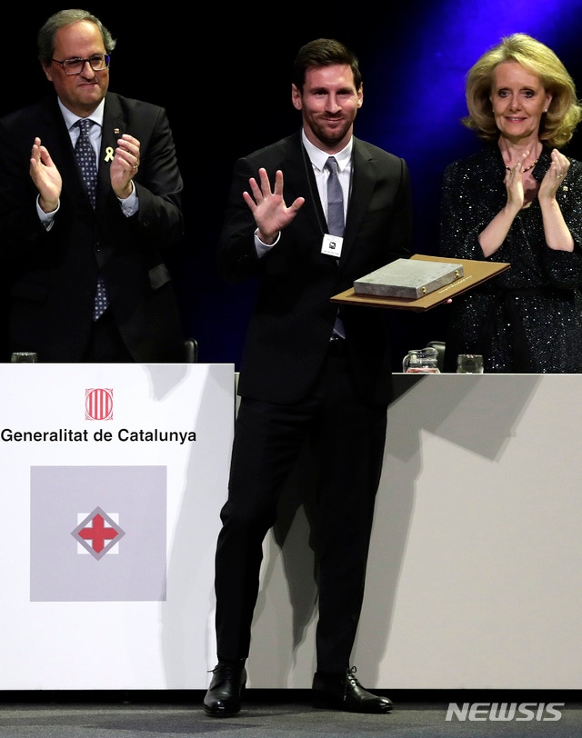 【바르셀로나=AP/뉴시스】FC 바르셀로나 리오넬 메시(가운데)가 16일(현지시간) 스페인 바르셀로나에서 스페인 카탈루냐 자치 정부로부터 크레우 데 산트 조르디 상을 받고 포즈를 취하고 있다.