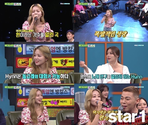 가수 HYNN(박혜원)이 역대급 가창력과 신선한 개인기로 존재감을 발휘했다. HYNN은 지난 6일 방송된 MBC에브리원 ‘비디오스타-다 취향 존중 특집! 비~스케치북’ 특집에 출연했다. 이날 HYNN은 오프닝부터 자신의 히트곡인 ‘시든 물을 주듯’을 열창, 절절한 감성과 폭발적인 성량을 뽐내며 존재감을 드러냈다. 이에 게스트들과 MC들 모두 감탄을 금치 못했다. 또 ‘슈퍼스타K’ 출연 당시 심사위원 에일리 앞에서 ‘하이어’를, ‘복면가왕’에서는 소찬휘 앞에서 ‘현명한 선택’을 부른 것과 관련해 ‘원곡자 도장깨기 전문 가수’로 소개돼 웃음을 자아내기도 했다. 이어 HYNN은 숨겨둔 개인기를 방출해 눈길을 끌었다. 머라이어 캐리의 ‘이모션’ 속 돌고래 초고음을 선보이는가 하면, 박정현과 양파 모창으로 뜨거운 박수를 받았다. 이날 ‘비디오스타’에 게스트로 함께 출연한 에일리는 HYNN의 활약을 지켜본 후 “노래 연구를 정말 많이 한다. 연습만 한다고 잘 되는게 아닌데, 너무 잘한다”고 ‘폭풍 극찬’을 쏟아냈다. HYNN이 과거 ‘인천 에일리’라는 애칭을 얻었던 만큼, 더욱 의미있는 평가였다. 한편, HYNN은 지난 해 3월 발매한 ‘시든 꽃에 물을 주듯’으로 큰 인기를 얻었으며, 최근까지도 주요 음원차트를 굳건히 지키는 등 ‘신흥 음원강자’로 자리매김했다. 또 지난 6월엔 ‘복면가왕’에서 최연소 가왕으로 선정되며 가창력을 인정받은 바 있다.