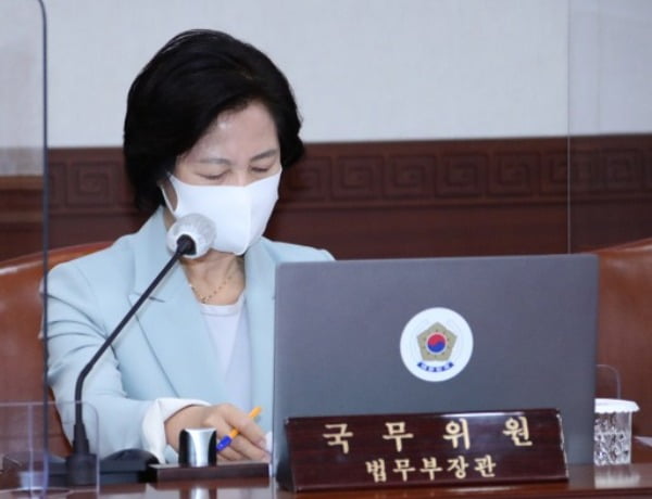 추미애 법무부 장관이 지난달 29일 정부서울청사에서 열린 영상국무회의에 참석해 자료를 보고 있다. /사진=연합뉴스