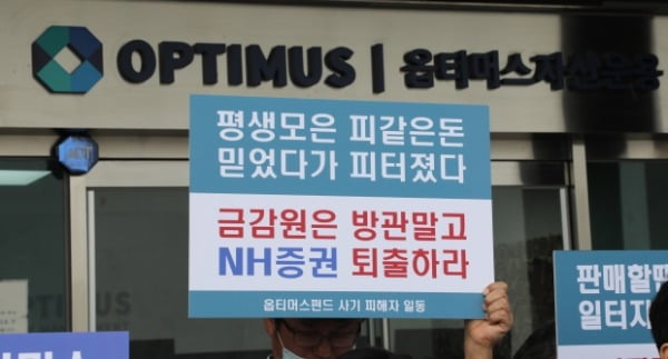 지난 7월15일 강남구 옵티머스자산운용 사무실 앞에서 피해자들이 시위를 하고 있다. /사진=연합뉴스 국민의당 "검찰 장악은 권력형 비리 막으려는 꼼수"