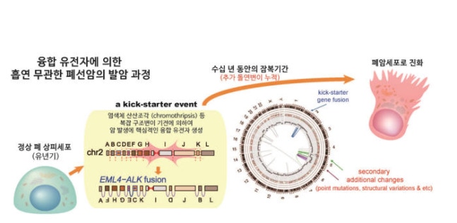융합 유전자에 따른 흡연 무관 폐선암 발암 과정흡연과 무관한 환경에서도 폐 선암이 발생할 수 있다는 연구결과가 나왔다. 이번 연구 성과는 비흡연자 폐암 발생 원인을 규명하고, 관련 정밀치료 시스템을 구축하는데 활용할 수 있을 전망이다.