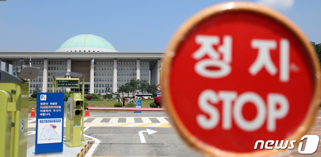 (서울=뉴스1) 김명섭 기자 = 12일 서울 여의도 국회 정문 정지간판 뒤로 본청이 보이고 있다. 내일이면 '패스트트랙' 상정으로 시작된 국회 파행 70일째다. 임시국회 소집이 지연되며 재난 및 경기하방 위험 대비를 위한 6조7000여억원 규모의 추경(추가경정예산)안 통과가 미뤄지고 있다. 2019.6.12/뉴스1