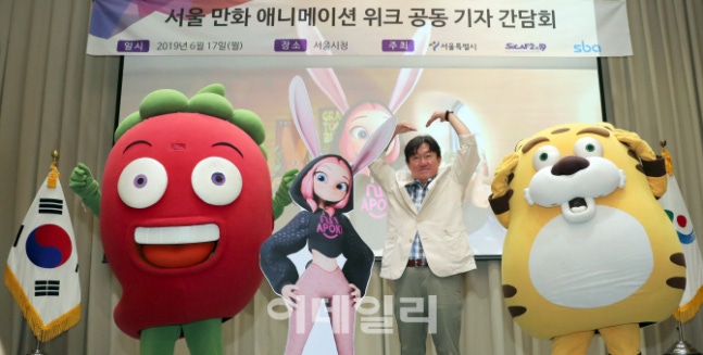 [이데일리 방인권 기자] 17일 서울시청에서 열린 '제23회 서울국제만화애니메이션페스티벌 SICAF 2019' 기자간담회에서 홍보대사인 디지털 연예인 아뽀끼(APOKI)가 방중혁 시카프 조직위원장과 함께 포즈를 취하고 있다.