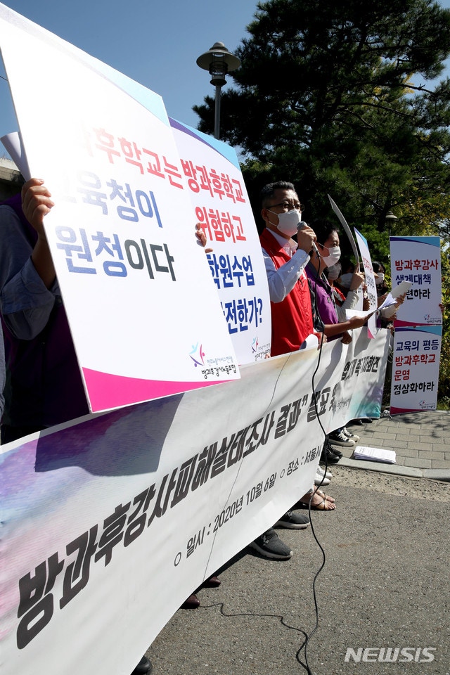 [서울=뉴시스]김병문 기자 = 민주노총서비스연맹 방과후강사노동조합 조합원들이 6일 오전 서울 종로구 서울특별시교육청 정문 앞에서 '코로나19로 인한 방과후강사 피해실태조사 결과' 발표 및 방과후학교 수업 재개 촉구 기자회견하고 있다. 2020.10.06.