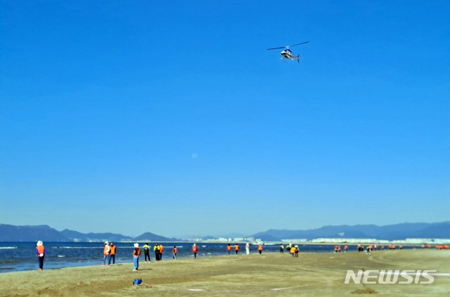 [부산=뉴시스] 중학생 1명이 실종된 부산 사하구 다대포해수욕장에서 6일 오전 부산해경, 부산소방재난본부 등이 이틀째 합동 수색을 펼치고 있다. (사진=부산소방재난본부 제공). 2020.10.06.