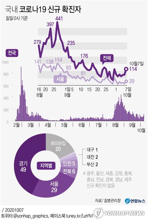 신규 확진자가 세 자릿수로 올라선 것은 지난달 30일 이후 1주일 만이다. 추석 연휴(9.30∼10.4)의 대규모 인구 이동이 확진자 수 증가에 영향을 미친 것으로 보인다.
