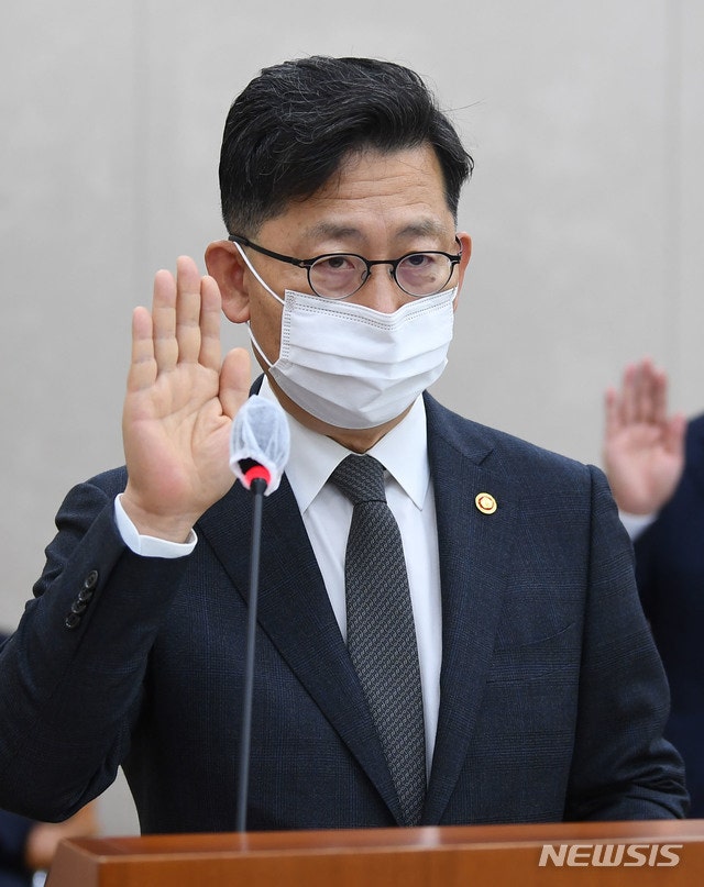 [서울=뉴시스] 김진아 기자 = 김현수 농림축산식품부 장관이 7일 서울 여의도 국회에서 열린 농림축산식품해양수산위원회의 농림축산식품부에 대한 국정감사에 출석해 선서를 하고 있다. (공동취재사진) 2020.10.07.