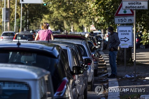 Motorists wait in line for their swab samples to be taken for Covid-19 testing by health workers at the drive-in during the Coronavirus emergency in Rome, Italy, 06 October 2020. Several regions, such as Lazio, the regional around Rome, and Campania, had already made facemasks obligatory outside after an upswing in coronavirus cases in recent weeks. EPA/ANGELO CARCONI