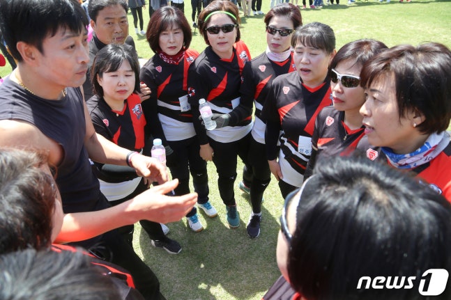 (구미=뉴스1) 정우용 기자 = 27일 경북 구미시 낙동강체육공원에서 열린 제27회 LG기 주부배구대회에서 코치가 주부선수들에게 작전을 지시하고 있다.