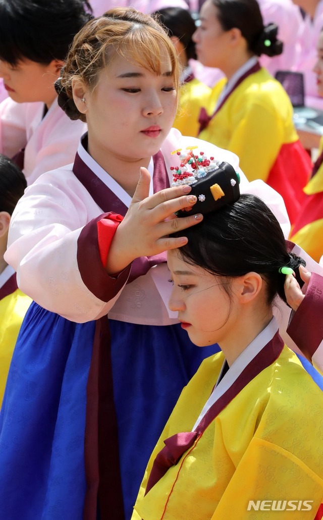 【서울=뉴시스】 고범준 기자 = 20일 오전 서울 중구 남산골 한옥마을 천우각 광장에서 열린 '제47회 성년의 날 기념 전통성년례'에서 성년자들이 가례(성인됨을 상징하는 복식을 갖춤)의식을 하고 있다. 2019.05.20.
